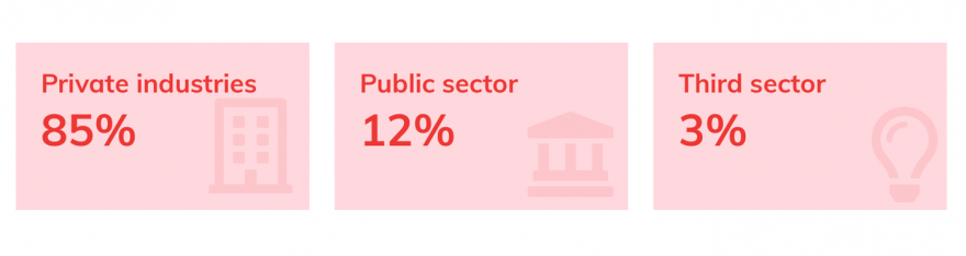 The majority of the design professionals – 85% - work in the private sector. Primarily in manufacturing of products and communication services. The 12% of design professionals that work in the public sector work primarily within education, science and research or general public services.